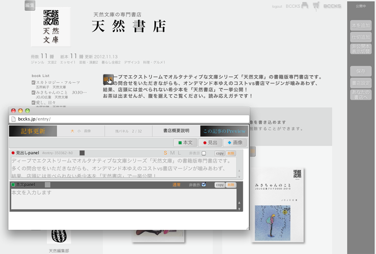 あなた専用の本棚で入手した本を管理したり、電子書籍を作成して販売したり、電子書籍からの紙本の作成したり、Web上での書店の開店したり、本を外部ストアへの配本したり…
